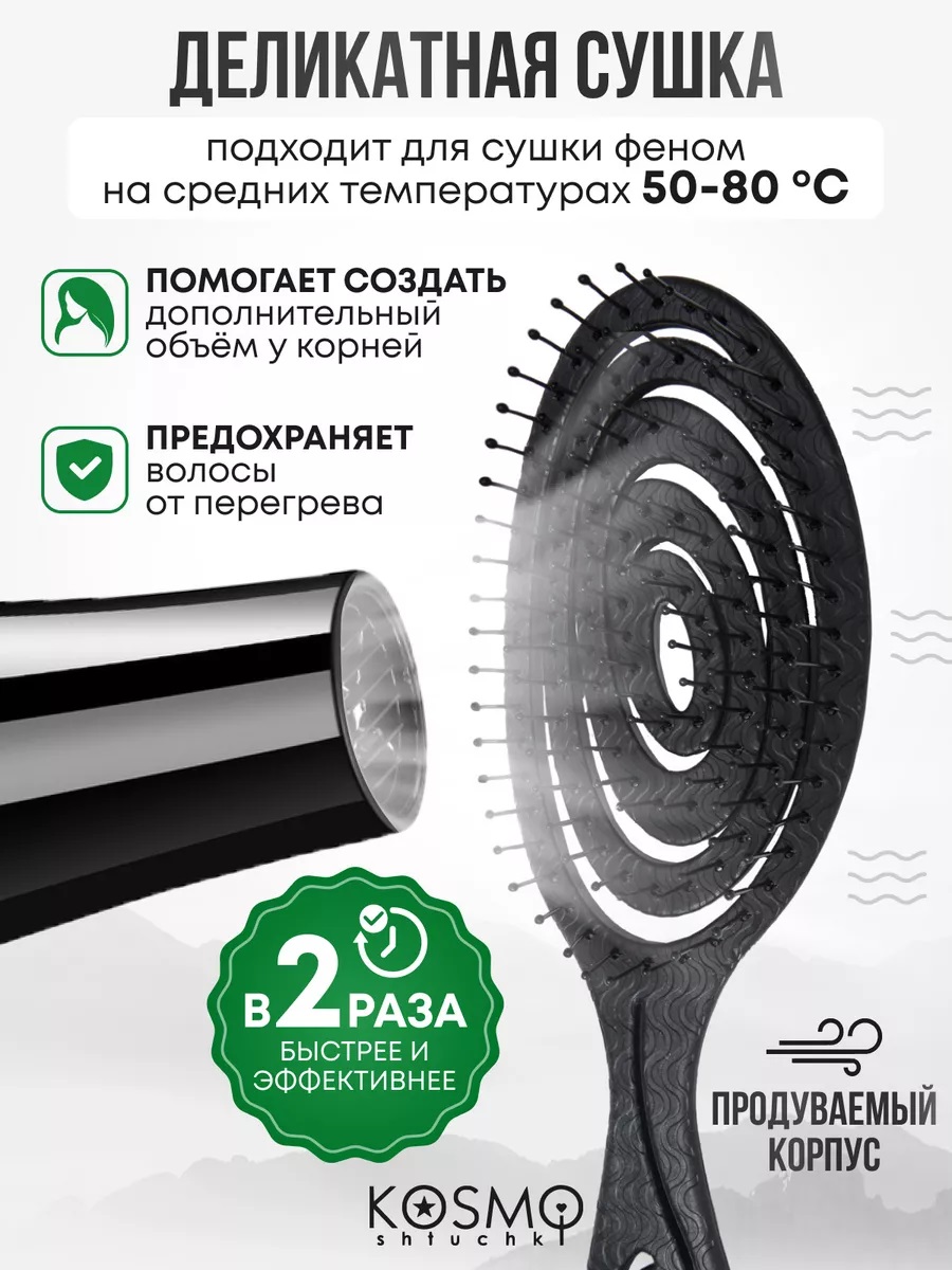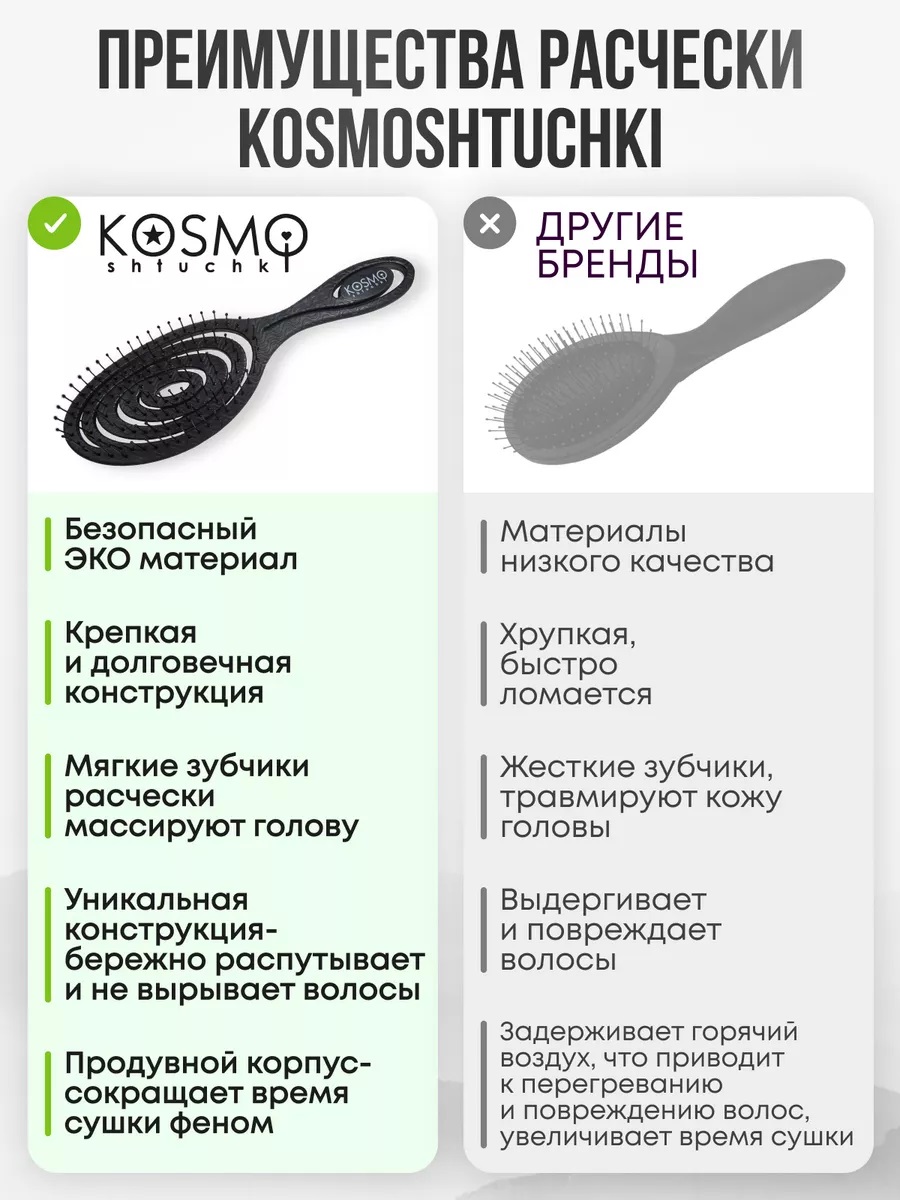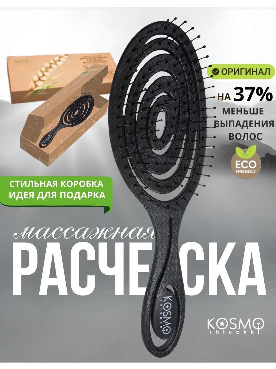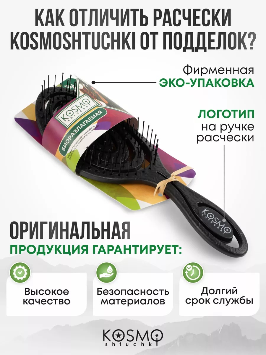 Расческа массажная для волос KosmoShtuchki создана с заботой о Вас и природе и идеальна в подарок, поэтому основа ее состава - растительные волокна. Мы знаем, что любые волосы требуют бережного отношения и уделили этому максимум внимания.