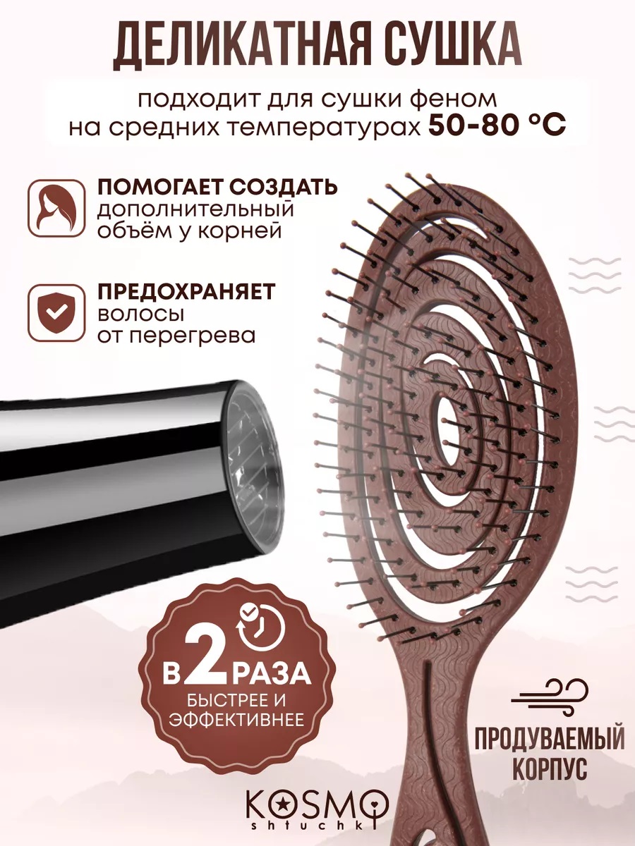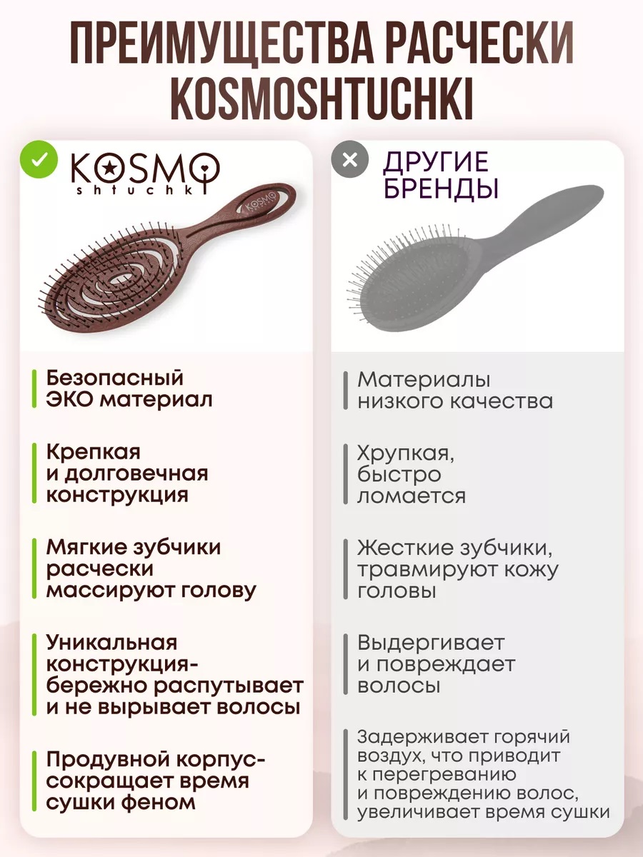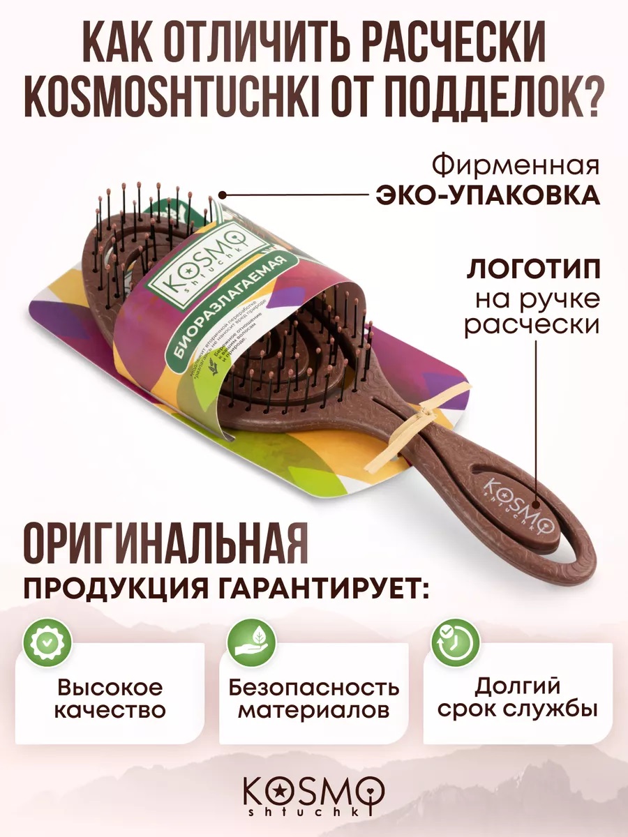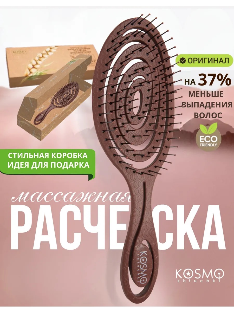 Расческа массажная для волос KosmoShtuchki создана с заботой о Вас и природе и идеальна в подарок, поэтому основа ее состава - растительные волокна. Мы знаем, что любые волосы требуют бережного отношения и уделили этому максимум внимания.