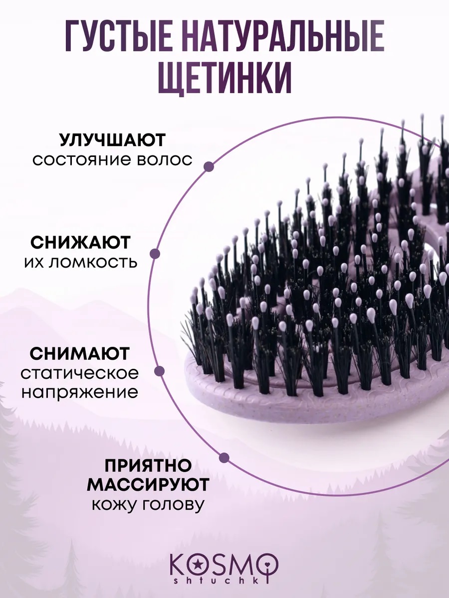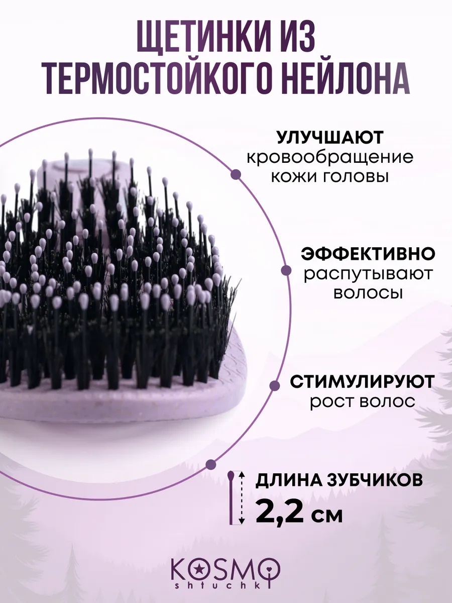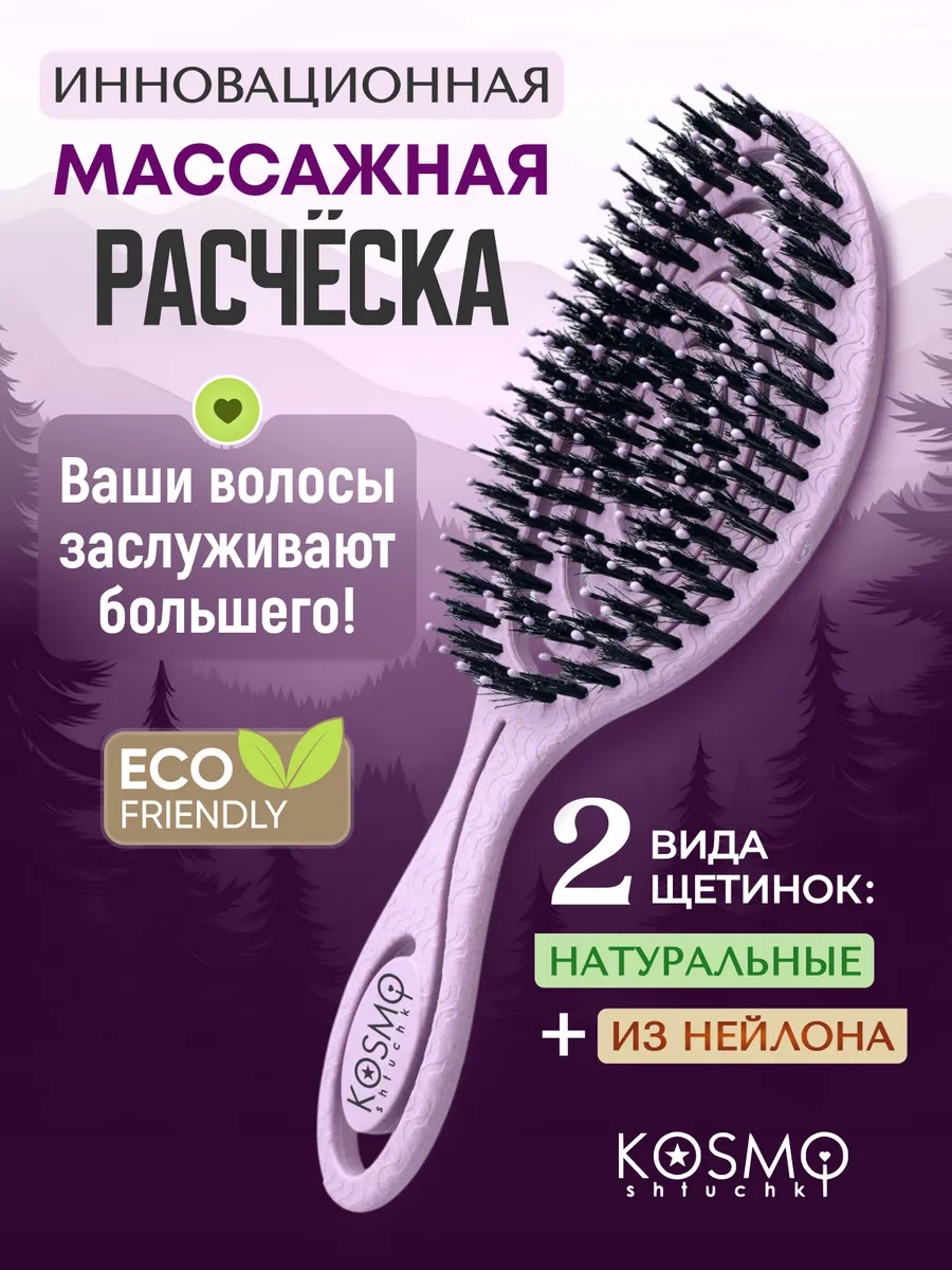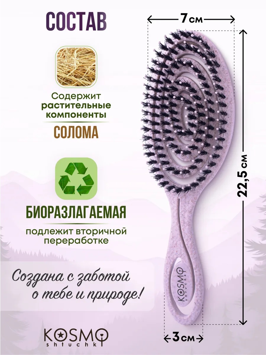 Расческа массажная для волос KosmoShtuchki создана с любовью к вам и заботой об окружающей среде и идеальна в подарок — её основа выполнена из экологичных растительных волокон. Такой материал не только безопасен для волос и кожи головы, но и соответствует современным трендам устойчивого потребления.