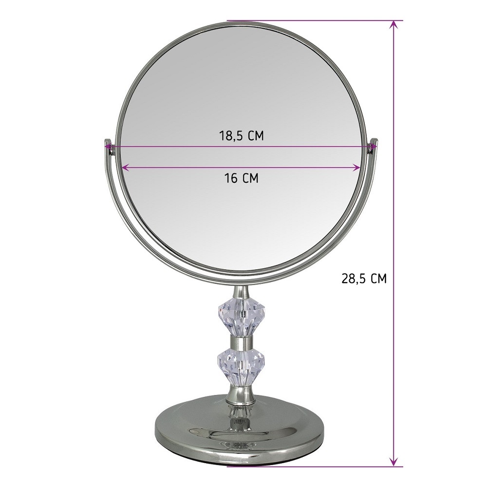 Диаметр зеркала 15 см, диаметр зеркала вместе с рамкой 16 см, высота зеркала вместе с подставкой 28.5 см.