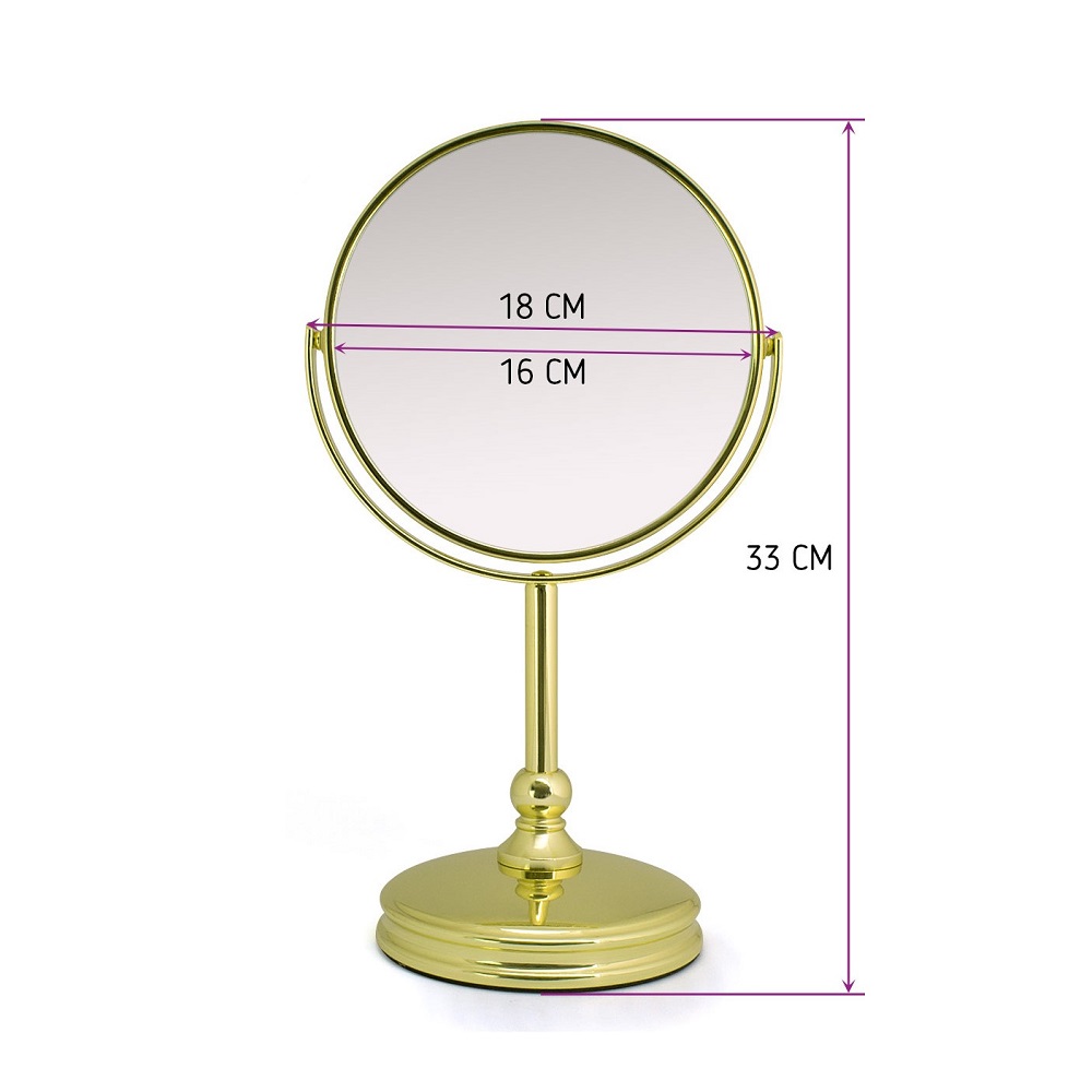 Диаметр зеркала без увеличения 16 см, диаметр зеркала с увеличением 15 см, высота зеркала вместе с подставкой 33 см.
